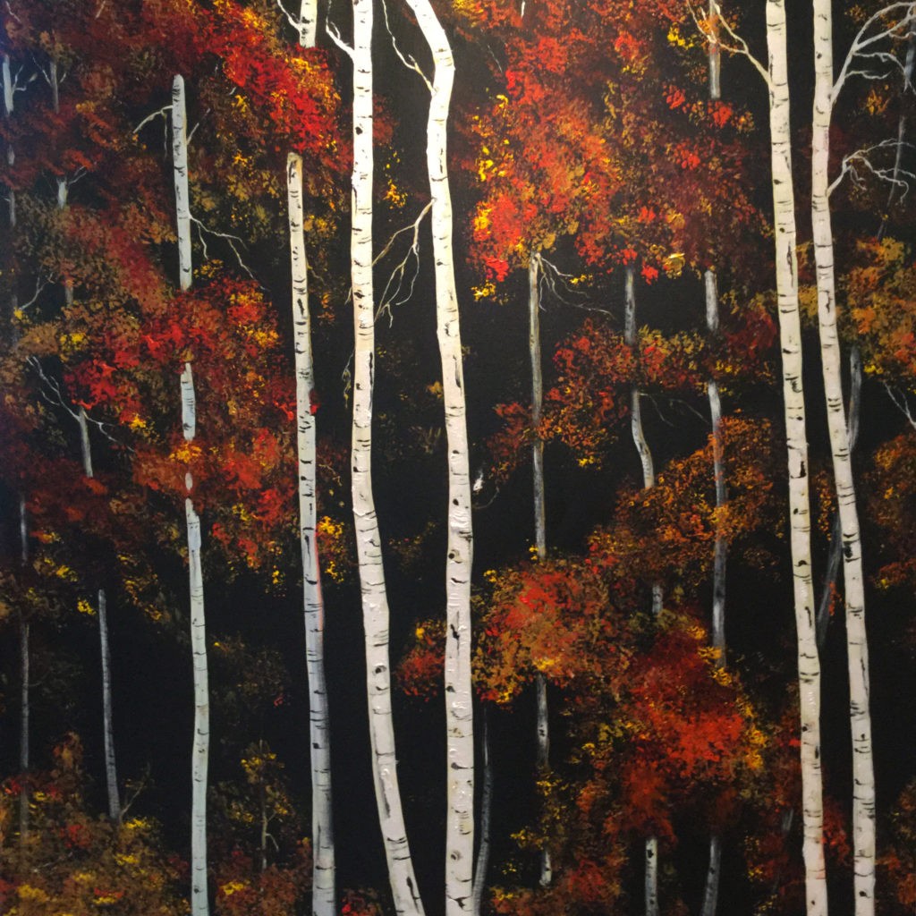 Birch trees flanked with Autumn leaves of red and orange, on a dark background.