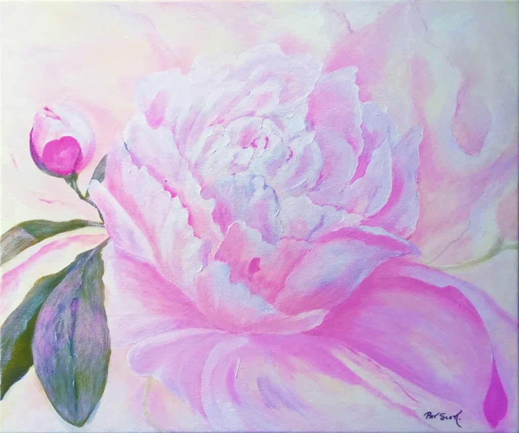 A pink peony with subtle blue hues seemingly floats over a light, cotton candy background.